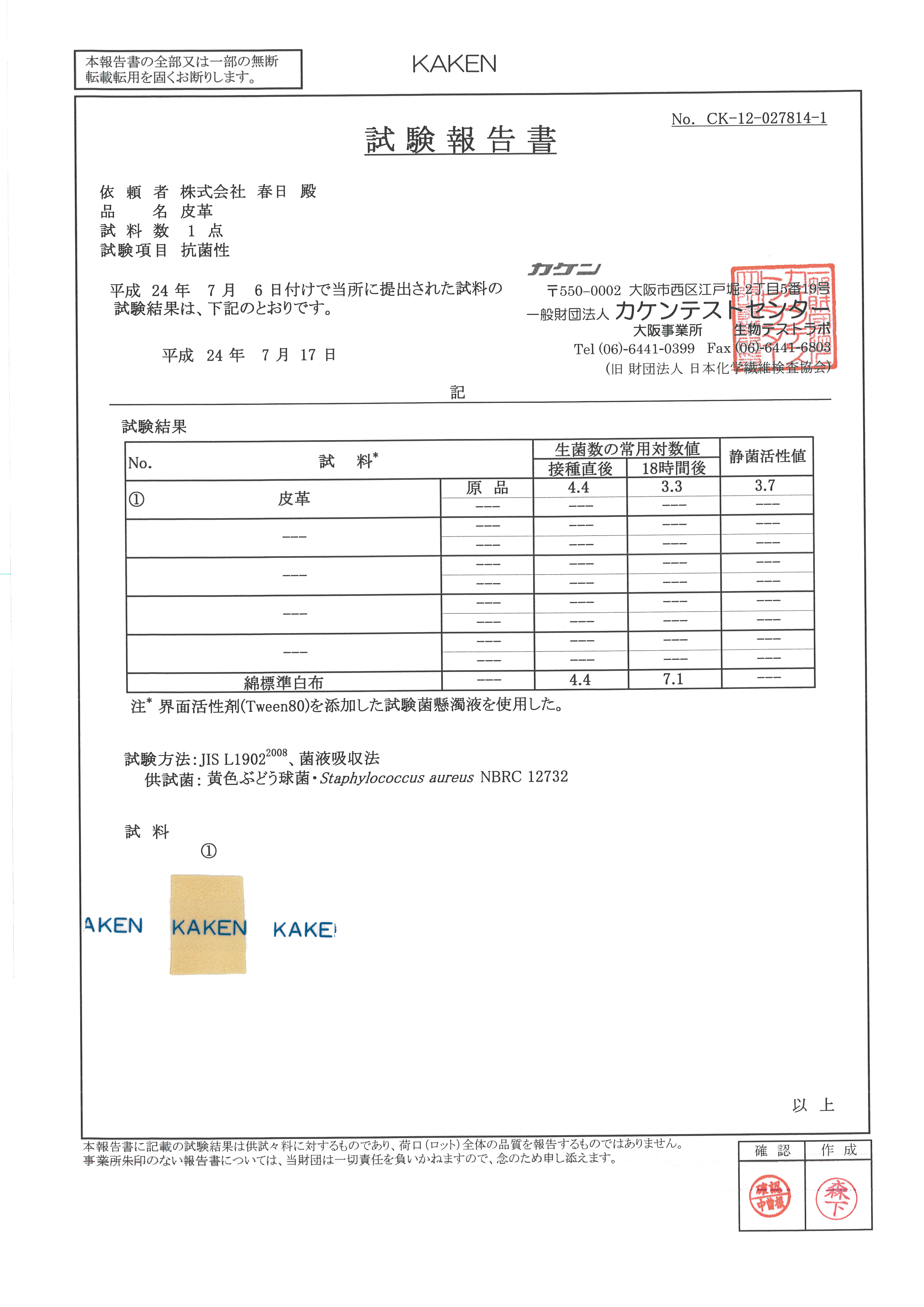 黄色ブドウ球菌抗菌テスト